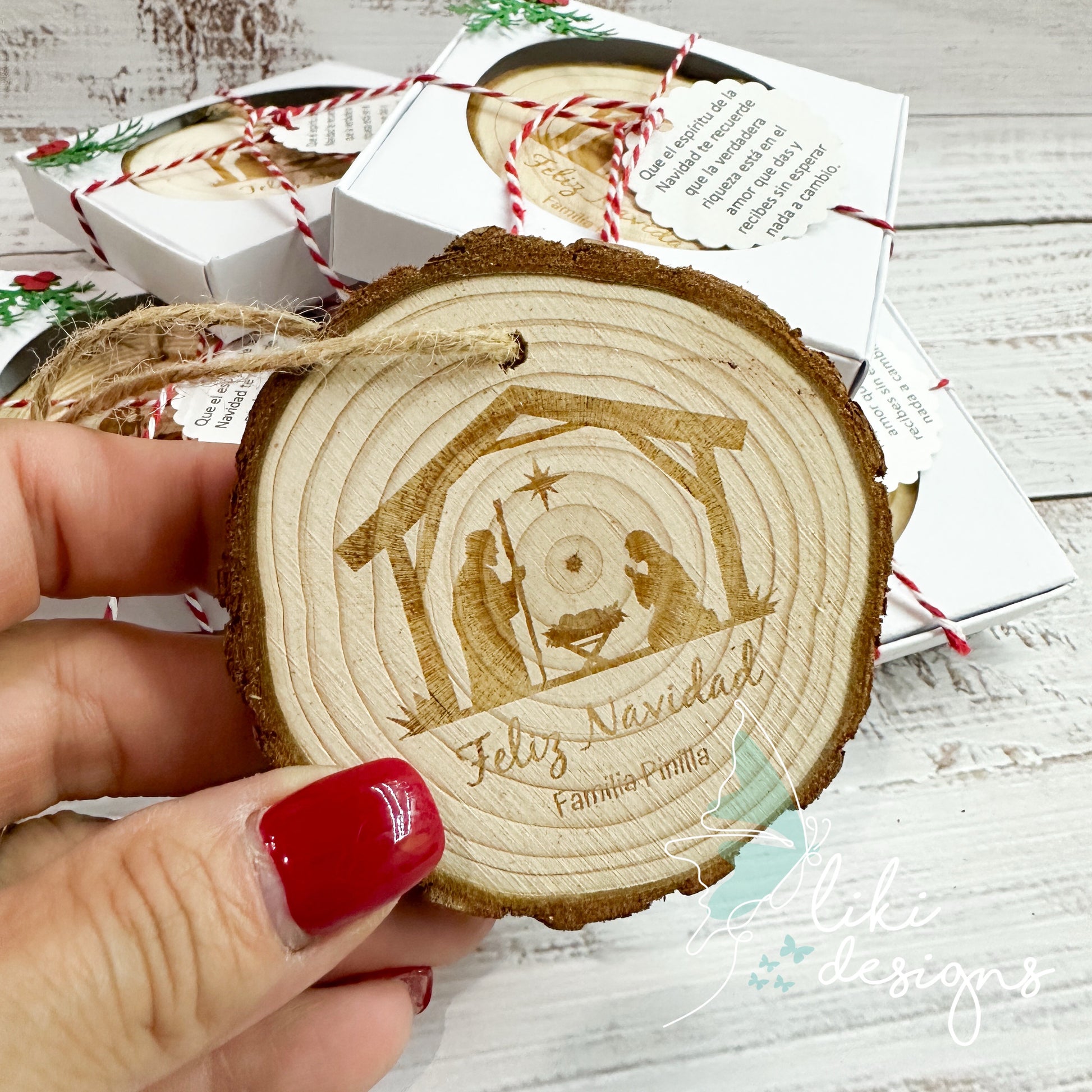 Each wood piece is approximately 2.8 - 3.1 inches in diameter and 0.35 inches thick, and come with twine and ready to hang. The packing box is for display purposes only and will not be shipped with the ornament. You can add it for an additional cost.
