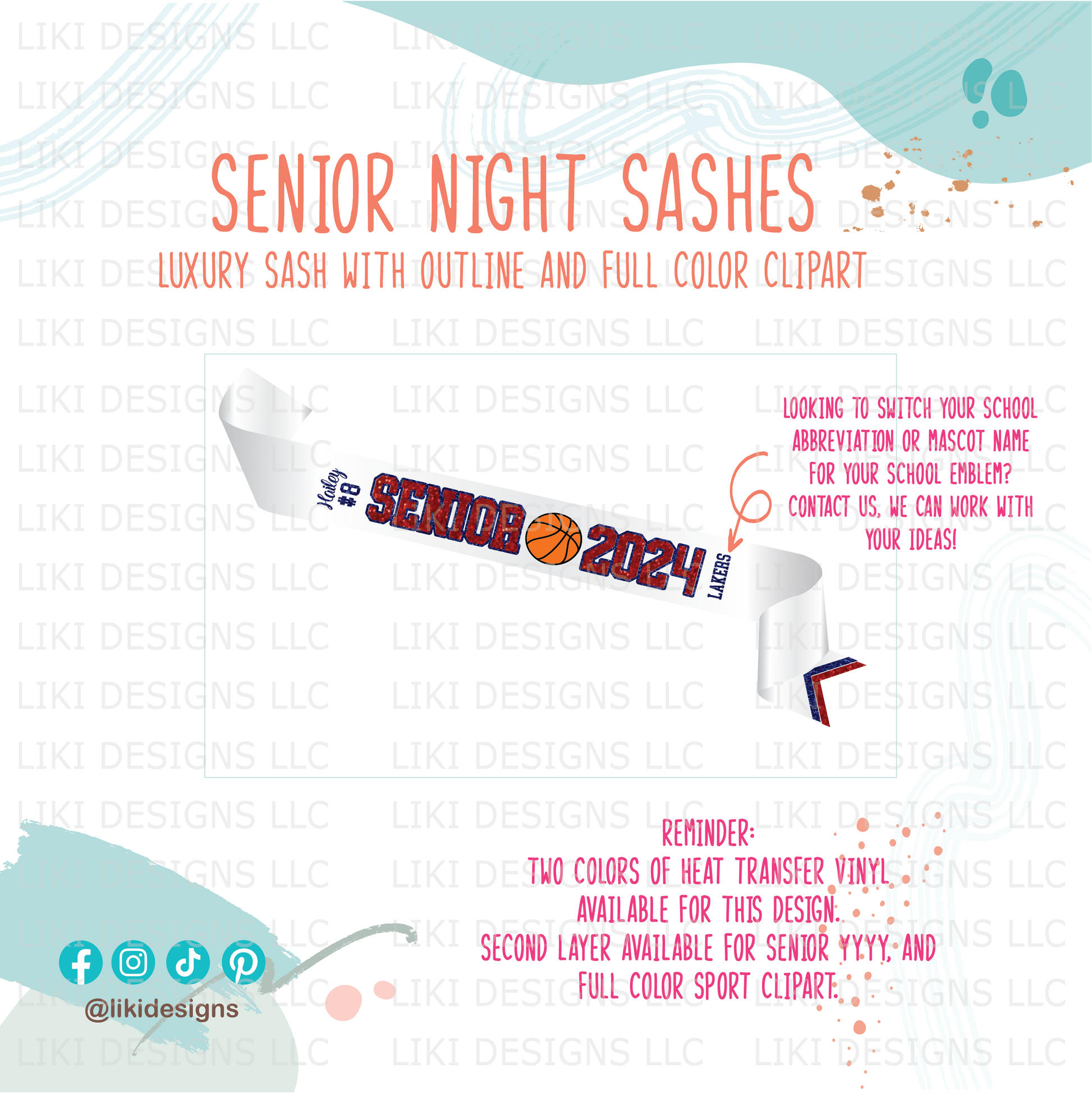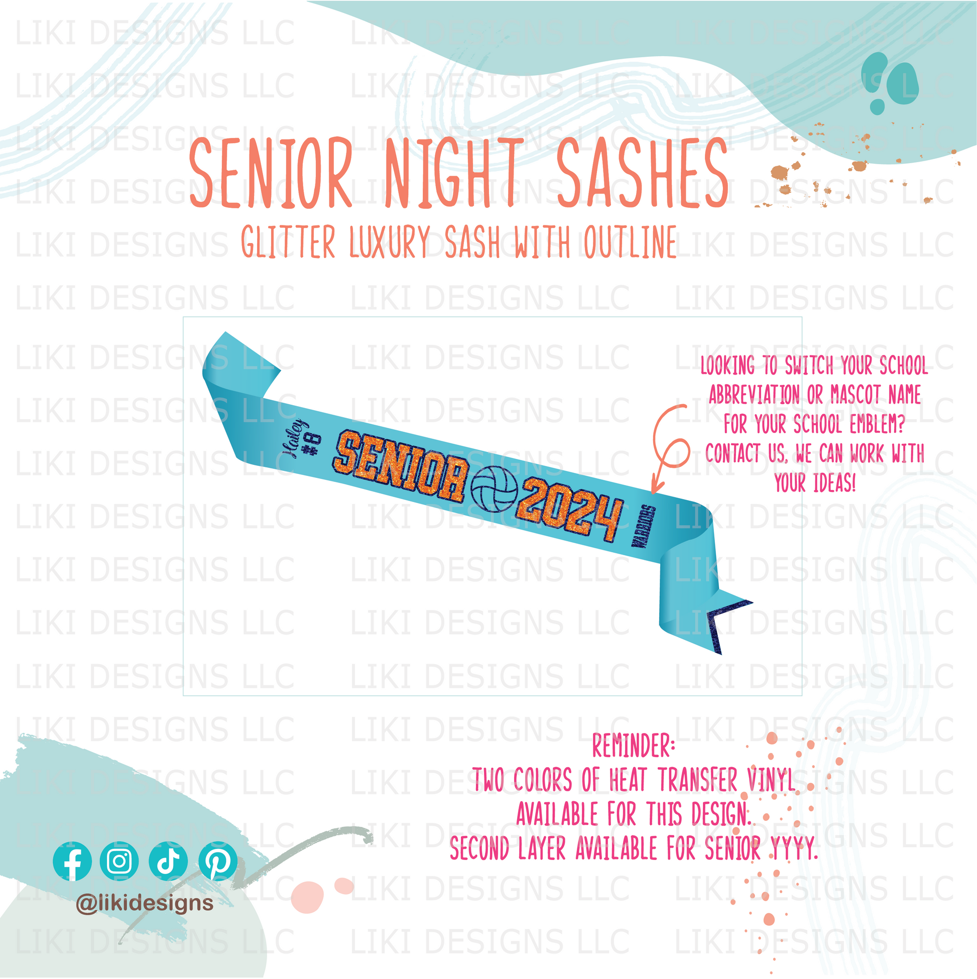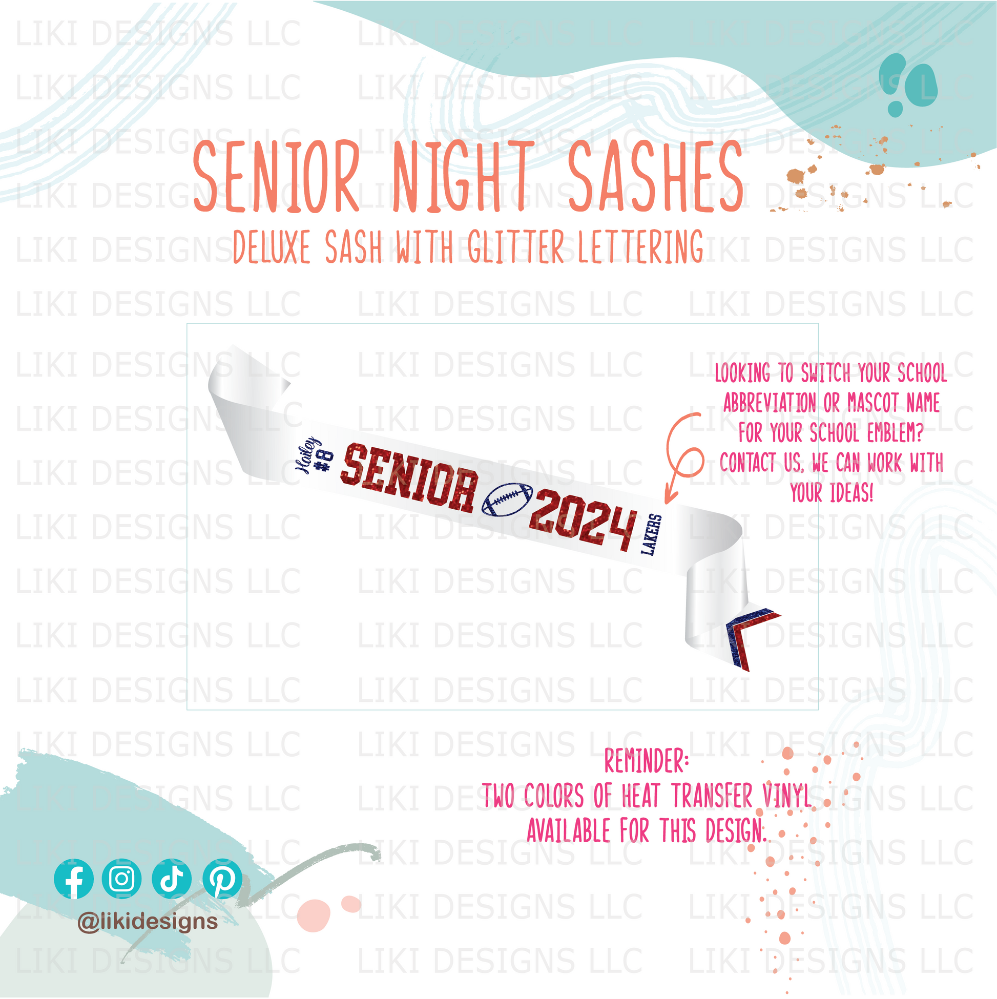 Premium Glitter: Design using GLITTER WHITE and one custom color of glitter heat transfer vinyl (HTV) with one-accent W finish (sash ending). Your custom color will be used for the lettering SENIOR year (yyyy). Please leave the notes at checkout.