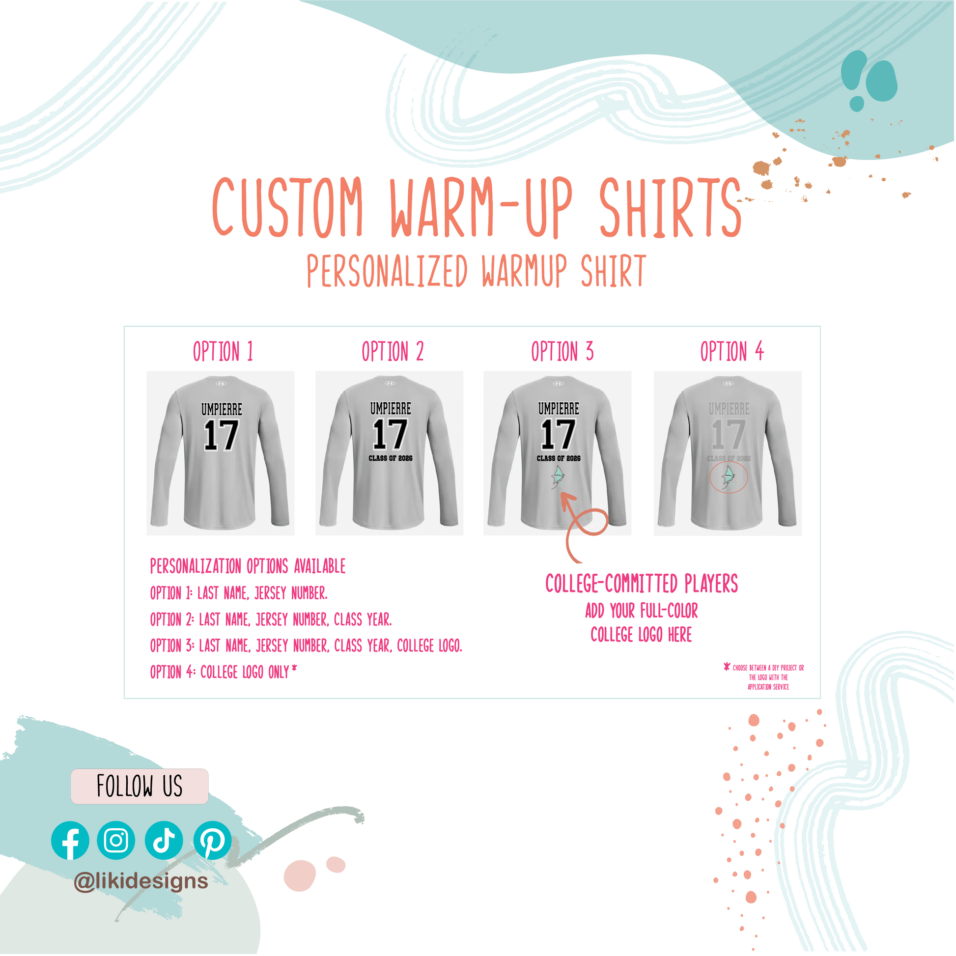 I have purchased numerous products from Likidesigns and all of them have been superb and complete with a great attention to detail. This is my third warm up shirt and first one with my daughter’s college commitment! It looks amazing and was done quickly and beautifully. I would definitely recommend this company.